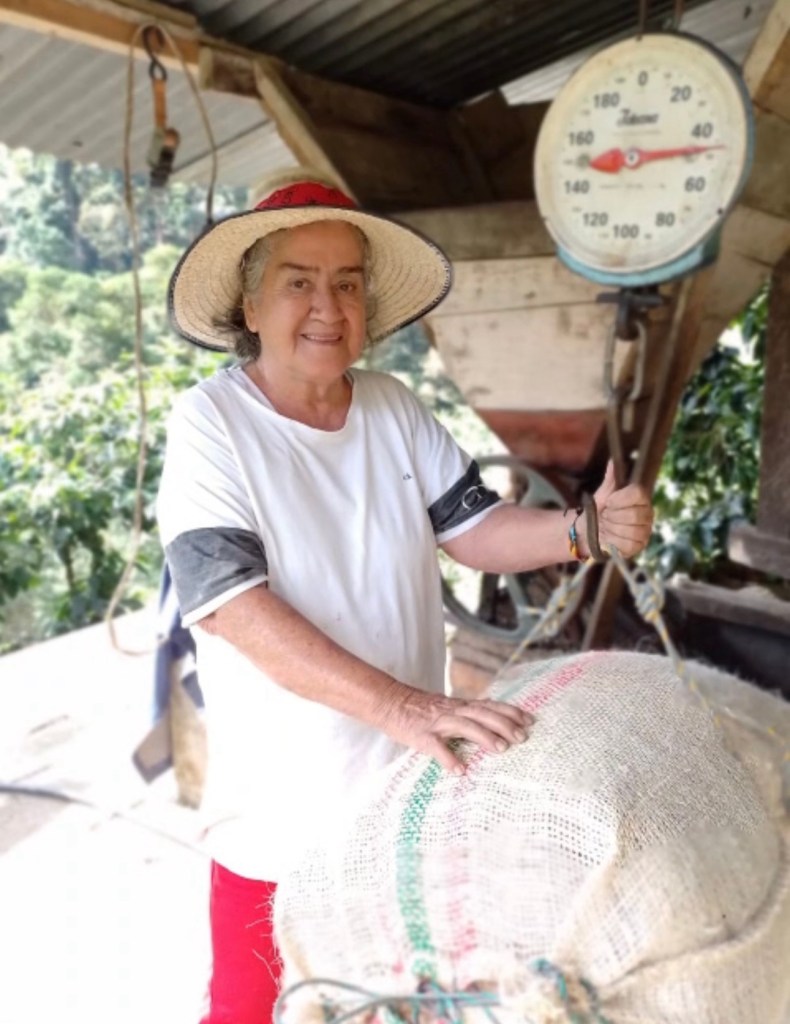 En esta historia, mi madre Laura pesa con orgullo un saco de café recién procesado. Su experiencia y amor por la tierra han sido guía e inspiración. Es ella quien nos enseñó que el café se cultiva con las manos, pero sobre todo con el corazón.